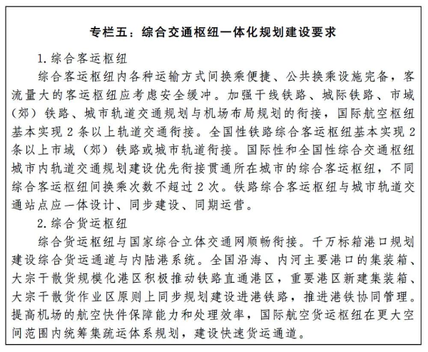 推進綜合交通樞紐一體化規(guī)劃建設。推進綜合交通樞紐及郵政快遞樞紐統(tǒng)一規(guī)劃、統(tǒng)一設計、統(tǒng)一建設、協(xié)同管理。推動新建綜合客運樞紐各種運輸方式集中布局,實現(xiàn)空間共享、立體或同臺換乘,打造全天候、一體化換乘環(huán)境。推動既有綜合客運樞紐整合交通設施、共享服務功能空間。加快綜合貨運樞紐多式聯(lián)運換裝設施與集疏運體系建設,統(tǒng)籌轉(zhuǎn)運、口岸、保稅、郵政快遞等功能,提升多式聯(lián)運效率與物流綜合服務水平。按照站城一體、產(chǎn)城融合、開放共享原則,做好樞紐發(fā)展空間預留、用地功能管控、開發(fā)時序協(xié)調(diào)。