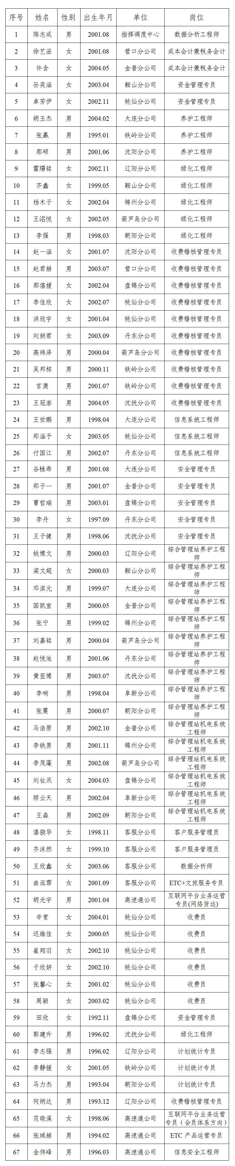 根據(jù)遼寧省高速公路運(yùn)營(yíng)管理有限責(zé)任公司招聘工作有關(guān)要求,經(jīng)過資格審核、筆試、面試、考察、體檢等程序,確定以下人員為擬聘用人員,現(xiàn)予以公示。公示期間如有問題,請(qǐng)向遼寧省高速公路運(yùn)營(yíng)管理有限責(zé)任公司致電反映。